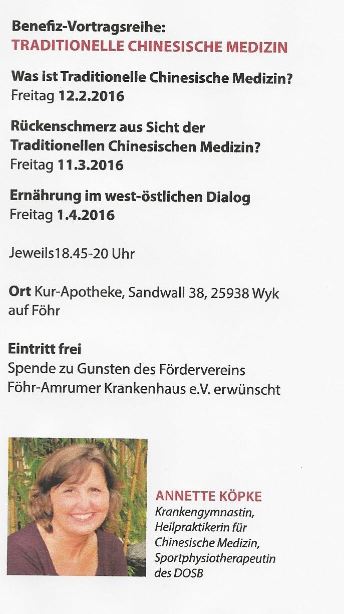 Nun gehen wir mit unseren Veranstaltungen bereits ins dritte Jahr und blicken bereits auf viele schöne Erfahrungen zu Themen außerhalb der schulmedizinischen Betrachtungsweise zurück. Das Interesse wächst weiter und in diesem Jahr werden wir noch einige Vorträge mehr im Programm haben. Starten wollen wir bereits im Februar mit einer kleinen Veranstaltungsreihe zum Thema "Chinesische Medizin". Annette Köpke wird uns in ihrer charmanten Art in drei spannenden Vorträgen mit der traditionellen chinesischen Medizin bekannt machen. Begleitet wird diese Vortragsreihe übrigens von Qigong-Kursen, die auch auf unsere Vortragsreihe abgestimmt wurden. Nähere Informationen zu Themen und Veranstaltungsterminen finden Sie unter http://www.praxis-koepke.de/aktuelle-kurse/.Ab Ende April 2016 besucht uns erneut Ursel Teubert auf unserer Insel. Sie gibt eine Einführung in das spannende Thema der energetischen Wirbelsäulenbegradigung, die dann auch in den folgenden Tagen durchgeführt werden kann. In den darauffolgenden Tagen bietet sie dann ihre sehr beliebten REIKI-Seminare an, Reiki I und Reiki II !Unser Tipp bei Interesse: Melden Sie sich rechtzeitig an, denn die Termine sind erfahrungsgemäß schnell ausgebucht! Am Ende der Seite finden Sie das passsende Anmeldeformular!