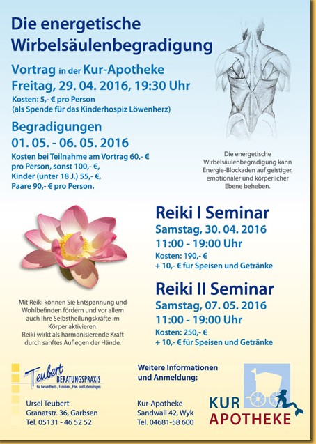 In der Zeit vom 01.05.-06.05.2016 bietet Therapeutin Ursel Teubert Energetische Wirbelsäulenbegradigungen auf Föhr an. Ein Informations- und Einführungsvortrag findet bei uns am: